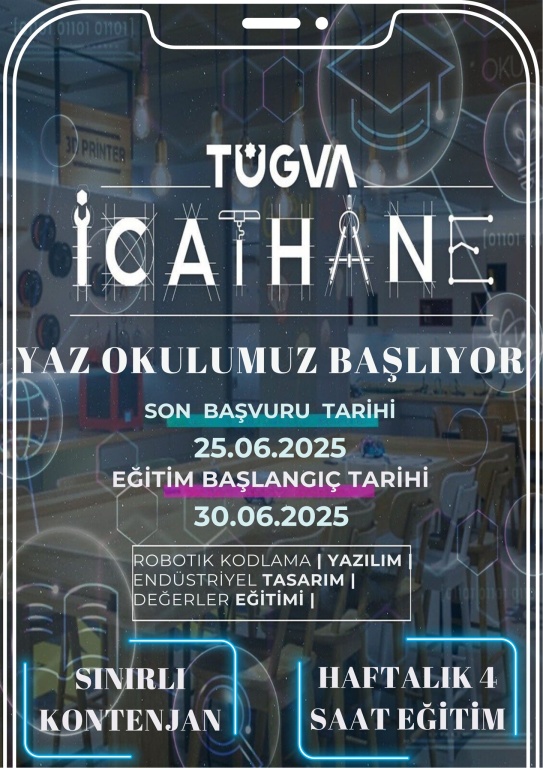 TÜGVA İCATHANE olarak ortaokul (5-6-7. sınıflar) ve lise (9-10-11. sınıflar) öğrencilerimiz için 30 Haziran – 31 Ağustos 2025 tarihleri arasında Yaz Okulu Programı düzenliyoruz.